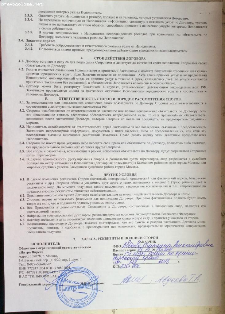 Причём за день до финального заседания меня вызвал адвокат Мантаев Н.В. и потребовал подписать акты о завершении дела, да и договор у этой конторы составлен таким образом, что я даже не могу им ничего предъявить. Подробнее об ООО Интра Вирес...