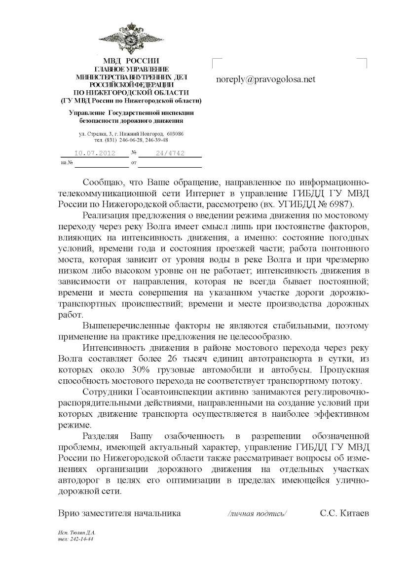 Сообщаю, что Ваше обращение, направленное по информационно-телекомму никационной сети Интернет в управление ГИБДД ГУ МВД России по Нижегородской области, рассмотрено (вх. УГИБДД № 6987).