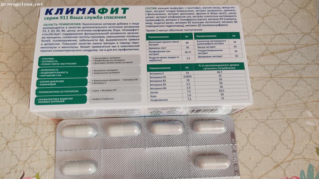 Доброго времени суток. Сегодня оставлю отзыв о препарате Климафит. Около года назад вступила в новый период совей жизни. Обратилась к врачу гинекологу, прошла осмотр, сдала анализы и после этого получила на руки рекомендации. Из препаратов я сама просила, чтобы назначили сначала негормональные препараты. Думаю, что начну с малого. а потом, если уже не поможет, тогда попрошу назначить более серьезные препараты. Климафит покупала через интернет аптеку, упаковка на 30 капсул обошлась мне в 500 рублей. В составе препарата присутствуют витамины, минеральные вещества и растительные экстракты. Курс врач мне прописал на месяц, потом оценить свое состояние и дальше решать вопрос о продолжении курса. Принимала два раза в день, утром и вечером. Капсулы стандартные, проглатываются легко, запивала небольшим количеством воды. Климафит прекрасно переносится, не вызвал никаких аллергических реакций. Наоборот, уменьшил все симптомы, потеть стала меньше, приливы не такие частые и сильные. в целом. физически ощущаю себя хорошо, нет слабости. Препарат рекомендую.