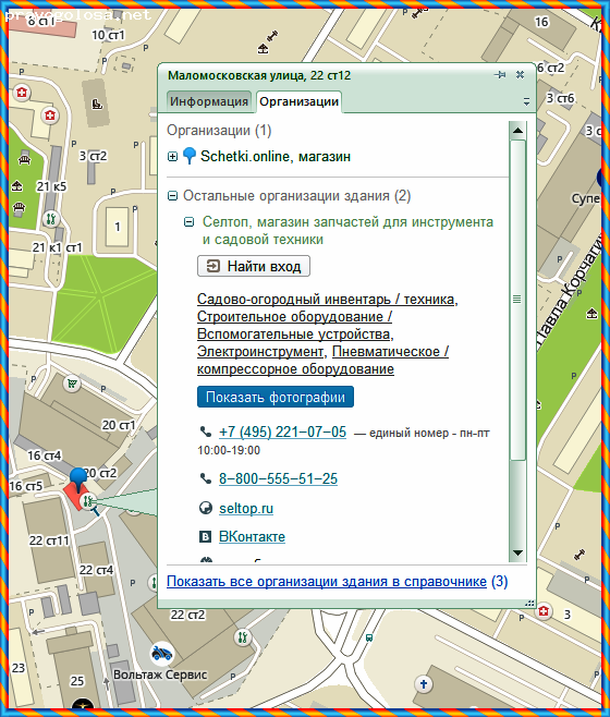 3. Все дурилки имеют липовые адреса и легко ловятся на этом. Бесплатный справочник «2ГИС» всем в помощь. В строении В строении Москва, Маломосковская, 22 ст12 действительно находится магазин запасных частей «seltop.ru» 8 (495) 221-07-05, 8 (800) 55-55-125, но к тупой дурилке makita-instrumeint.ru +7 (495) 251-58-51 он отношения не имеет (см. скриншот).