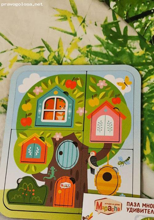 На дерево наклеена прочная бумага с яркими иллюстрациями. Все персонажи узнаваемы, сын запоминает и потом легко находит их в своих книжках. По картинкам мы изучаем цвета, отыскиваем мам и их малышей, ищем для них «домики», придумываем маленькие рассказы. Полезно это занятие и для развития мелкой моторики. Подробнее об Игрушки Mapacha...