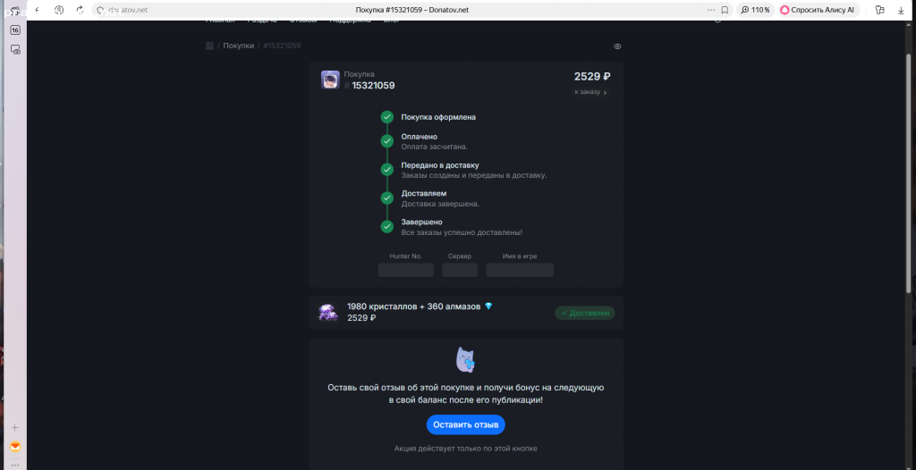Магазин игрового доната (donatov.net) Москва Положительный отзыв