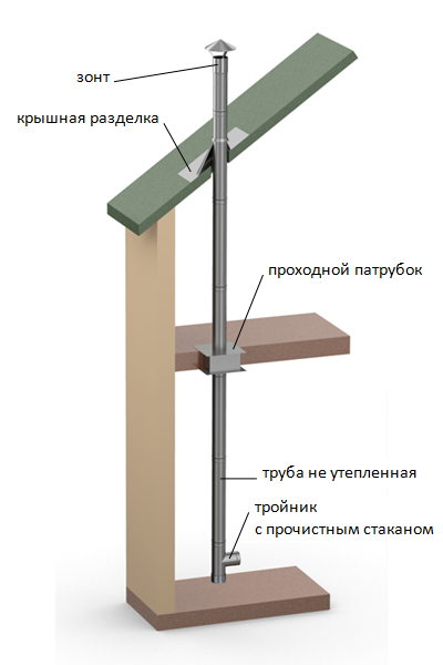 Дымоход лучше ставить не утепленный и пропускать через дом и крышу, см. на картинке, так он еще дополнительное тепло дает.