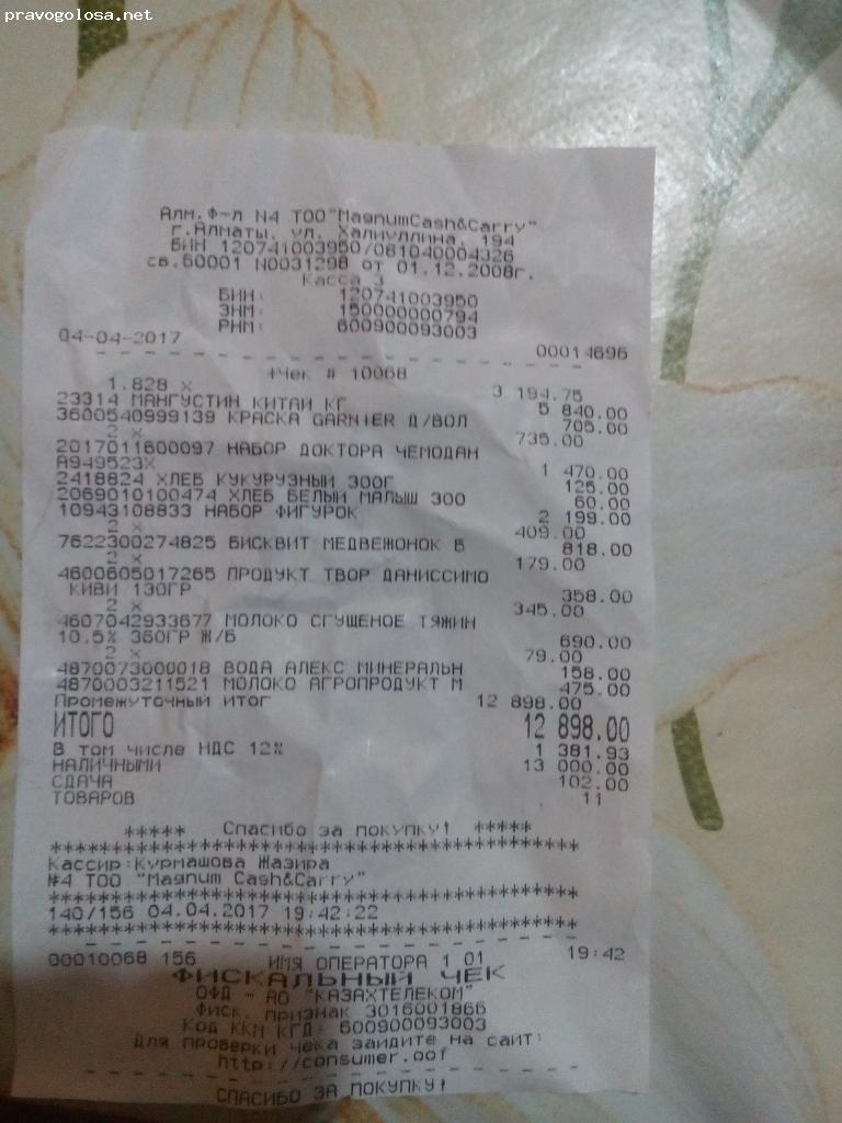 Этот пост честно, создавать желания не было! Но чек спустя три дня дома нашёлся и на нём стоит 3 касса, в которой "якобы" нашего чека не было выбито! Именно это и стало причиной данного поста! Отправьте всем своим знакомым, и в группы, чтобы все понимали насколько наглые, хитрые и бессовестные сотрудники Магнума!!! Ничего нигде человеческого не осталось! Без чека у вас будут специально испытывать терпение, чтобы вам надоело ждать и вы подарили им свои деньги! Противно осознавать, что вот так, чтобы избежать лишнего шума намеренно изображают "внимательный" персонал! Подробнее о Торговый Комплекс «Magnum» на Рыскулова...