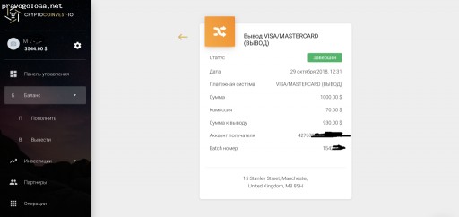 Теперь ближе к делу. Я изучил весь сайт, все тарифы и тд, решил сделать вклад по тарифу Классик на месяц, и внес сумму 650 долларов. Там можно отслеживать прибыль, и я видел как сумма растет, но снять можно только через месяц. Поэтому я параллельно сделал еще несколько вкладов по разным тарифам. В итоге, через месяц с этого первого вклада я вывел 1000 баксов уже. Правда тут комиссия 7% на вывод, но тем не менее. На ровном месте заработать 300 баксов не отходя от компа – по-моему очень достойно)) Ну и с других вкладов я тоже поимел очень хорошо. Так что на cryptocoinvest.io можно и нужно реально зарабатывать деньги. Проект 100% работает, и пока такая возможность есть – надо пользоваться. По скринам из личного кабинета, я думаю все понятно будет. И кстати, ввод и вывод можно осуществить многими способами. Как видно из скрина, я вкладывал и выводил деньги себе на простую банковскую карту, приходит все очень быстро. Буквально 30-40 минут. Подробнее о Криптовалютная платформа CRYPTOCOINVEST.IO...