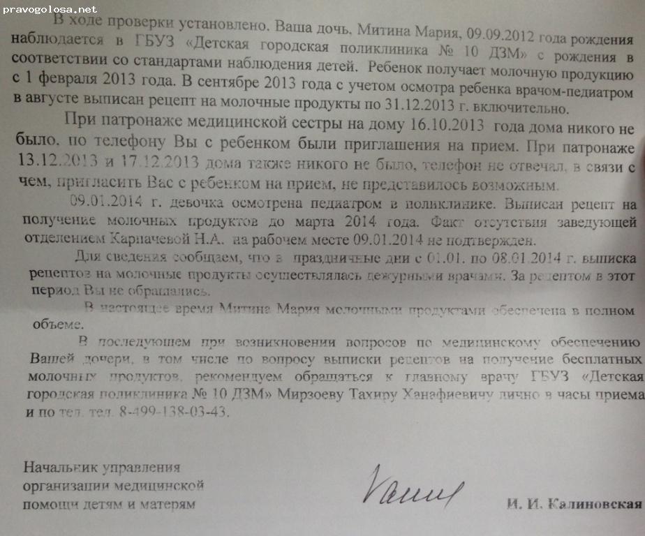 На мою жалобу в Департамент здравоохранения г. Москвы, Дирекцию по обеспечению деятельности государственных учреждений здравоохранения ЮЗАО, Росздравнадзор, были получены формальные отписки. В итоге виновными в данной ситуации были объявлены я и мой ребенок, в действиях поликлиники вышестоящими организациями не было усмотрено никаких нарушений прав ребенка на получение натуральной помощи, действия поликлиники данные организации признали законными и руководствовались выполнением внутренних приказов №132, 1346н, о которых я за весь период наблюдения в ДГП №10 ни разу не была ознакомлена под роспись, несмотря на то что закон города Москвы не привязывает оказание натуральной помощи к вышеуказанным приказам, плановым осмотрам и пр. Вышестоящие организации не отстаивают интересы ребенка, а поддерживают неправомерные действия поликлиники.