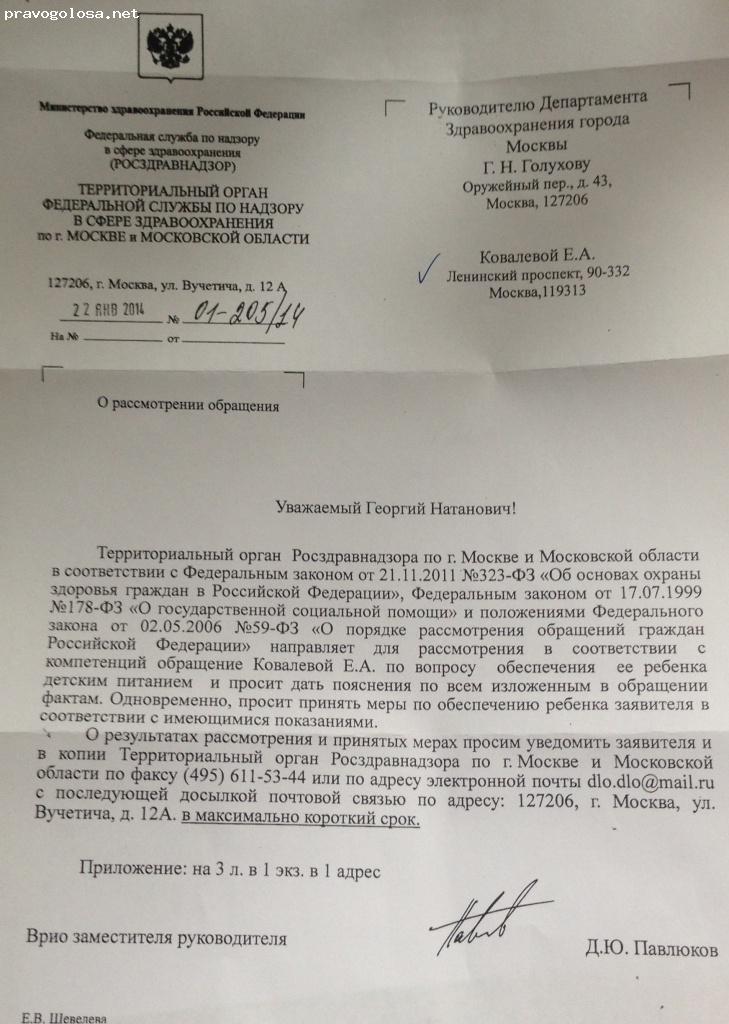 Прошу разъяснить чем руководствоваться и почему для Департамента здравоохранения г. Москвы, Дирекции по обеспечению деятельности государственных учреждений здравоохранения ЮЗАО, Росздравнадзора закон г. Москвы №60 от 23.11.2005 не является обязательным к исполнению документом, а приказы становятся превыше закона г.Москвы, почему организация поддерживает врачей (подведомственную организацию), а не интересы матери и ребенка, который на полмесяца был лишен положенного ему от Правительства Москвы питания. Почему получение положенной по закону натуральной помощи увязывают с медицинскими процедурами, осмотром, каким-то непонятным патронажем после года, которого не могло быть и не было, т.к. я все время находилась дома? Почему никого не привлекли к ответственности и даже не принесли извинения за данные действия?