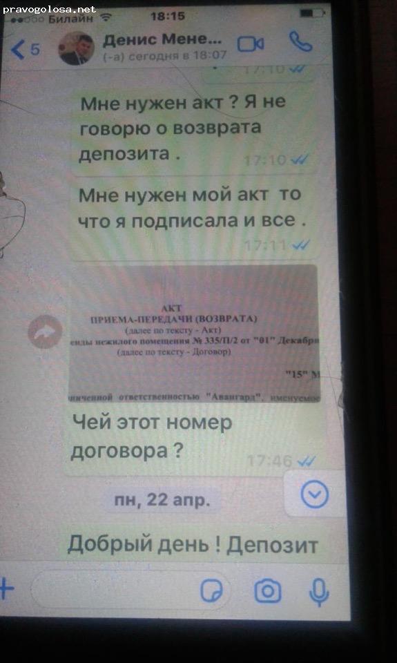 Добрый день! Письмо с вопросом генеральному директору ООО Трест групп Морозову Алексею Валентиновичу . Можно узнать причину о не возврате депозита и остатка аренды по договору 59/335/П/8.1 от 22 декабря 2017 Попадюк Людмила. То менеджер Берсенев Денис хамит или не его проблемы говорит .