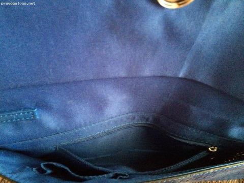 Теперь немного опишу свою покупку. Собственно, ничего сверхъестественного нет. Застегивается на кнопочку, есть цепочка для ношения на плече. Цепочка окрашена в золотистый цвет, у меня до этого все сумки были только на ремешках. Данный клатч подходит для вечерних каких-то нарядов, праздничный вариант такой, не для повседневного ношения. Рисунок клатча сзади, такой же, как и спереди. Несмотря на то, что это клатч, он обладает хорошей вместительностью. Внутри он имеет одно большее общее отделение, маленький кармашек, застегивающийся на молнию и одно не застегивающееся отделение. Уместится много всего. Подкладка синего цвета, на ощупь приятная, материал прочный, прошита очень хорошо. Данный клатч выполнен безукоризненно. И больше внутри ничего особенного интересного нет, заполнить пустоту можно всем, на что хватит фантазии и, разумеется, места. В руке такой клатч смотрится очень эффектно и необычно.